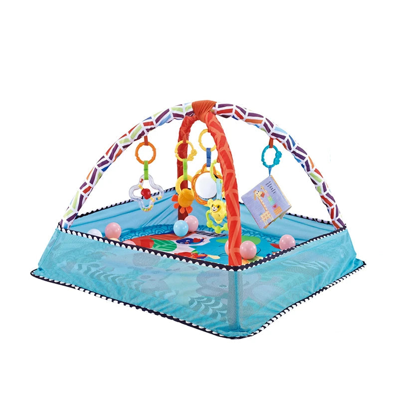 Il développe la motricité (roulade, appui sur les bras), stimule les sens grâce aux couleurs, textures et jouets suspendus, et encourage la coordination œil-main. C’est aussi un espace de jeu sécurisé et confortable.